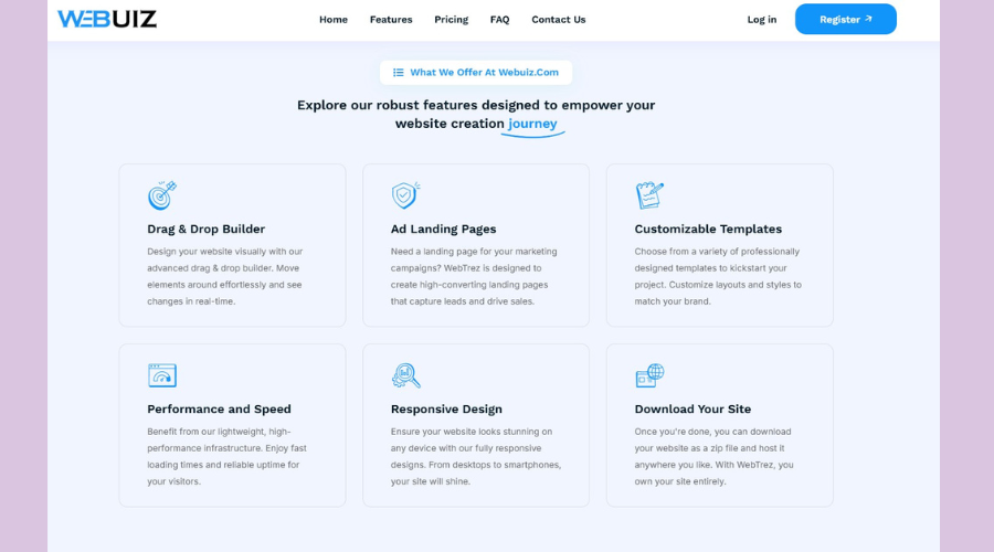 Responsive Design: Every website built on Webuiz is fully responsive, ensuring it looks great on all devices, from desktops to smartphones.